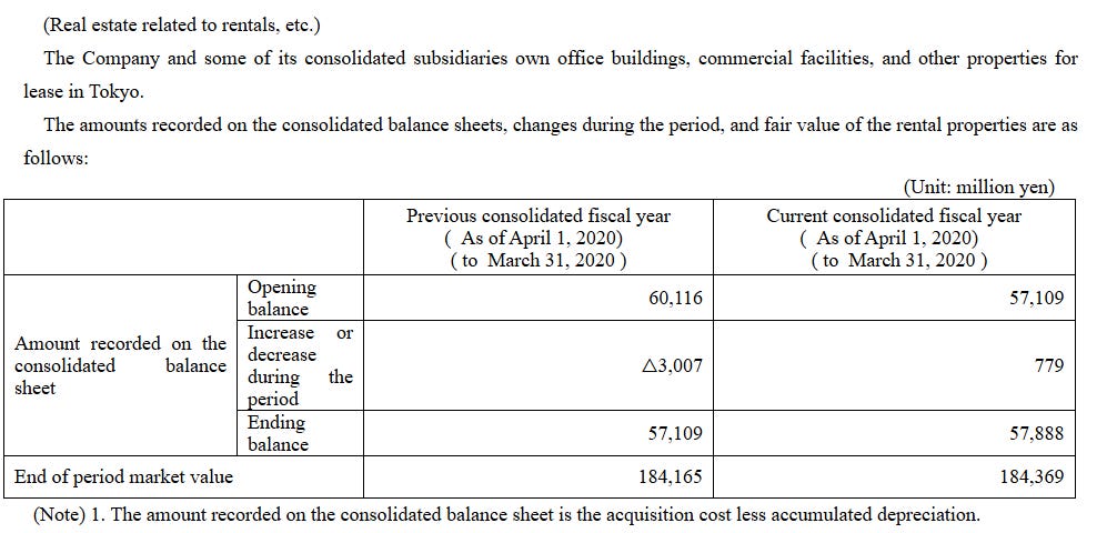 The pitch here is pretty straightforward. This is a real estate company in Tokyo that owns real estate assets worth significantly more than their carrying value. The company also has a large net cash position and investment securities, which are easy to value. Backing out the value of these assets gets us an adjusted EV of ~¥28 billion. ¥28 billion for ¥57.8 billion of real estate at book value isn’t a bad deal, but what makes this interesting is that the fair market value of the real estate (according to the company’s annual report) is ¥184.3 billion.