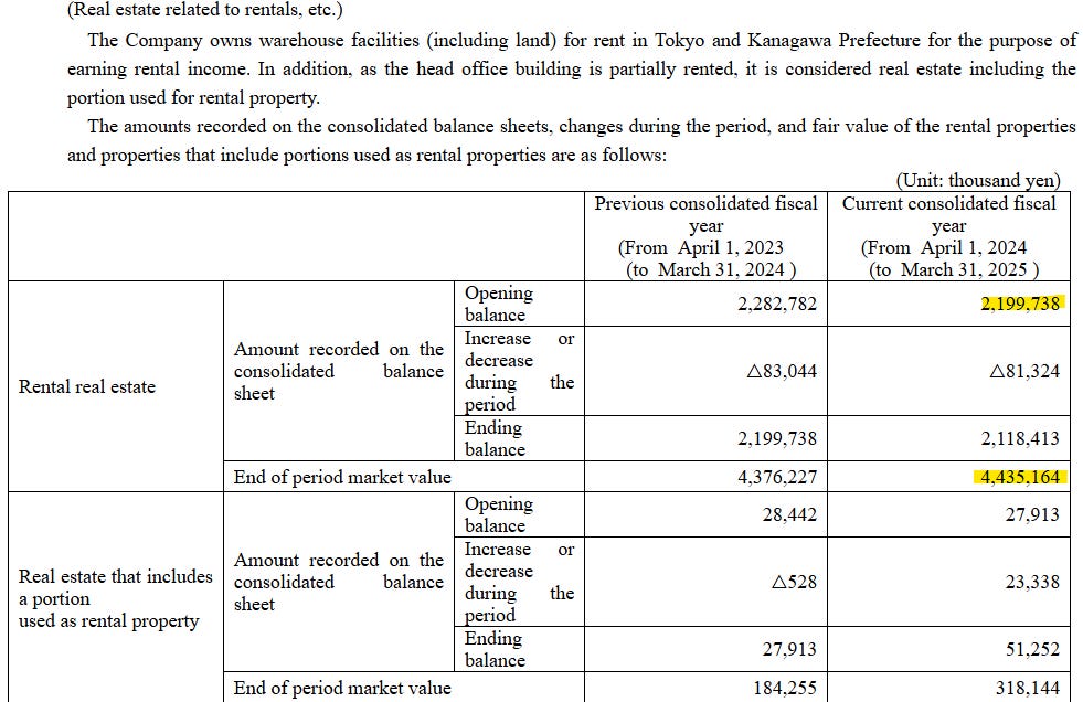 Takase owns logistics assets in Sapporo, Tokyo, and Kawasaki. Some properties are leased out to third parties to generate rental income while others are operated by the company. The rental assets have a book value of ¥2.1 billion but fair value is ¥4.4 billion, which is an uplift of ¥2.3 billion (vs a market cap of just ¥2.5 billion and adjusted mcap of ¥700 million!). There is no clear breakdown of which properties are rented out vs owner-operated except for rental properties being located in “Tokyo and Kanagawa.”