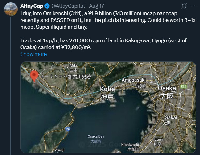 While ‘undervalued land asset’ plays can be interesting, I don’t like making bets in the space unless the operating company is consistently profitable. One idea I passed on recently was Omikenshi (3111). For a quick look at that idea, click the link below to my X post.