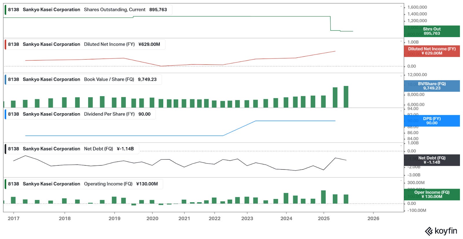 Massive accretive buyback. In February 2025, Sankyo Kasei repurchased 31% of outstanding shares, almost entirely from Black Clover and Swiss-Asia. These shares have since been canceled. In May 2025, the company repurchased another 2.5% of outstanding shares. Shares outstanding have fallen from 1,333,699 to 895,765.